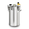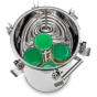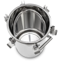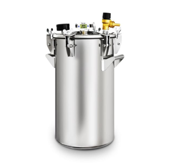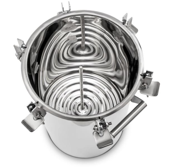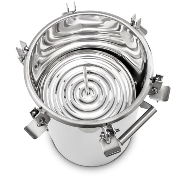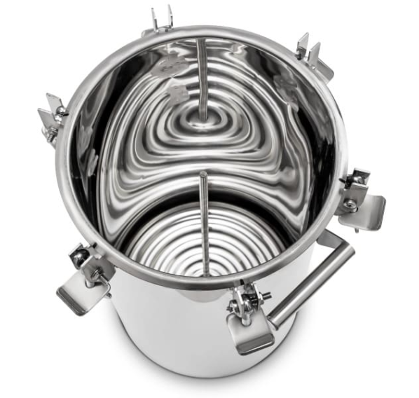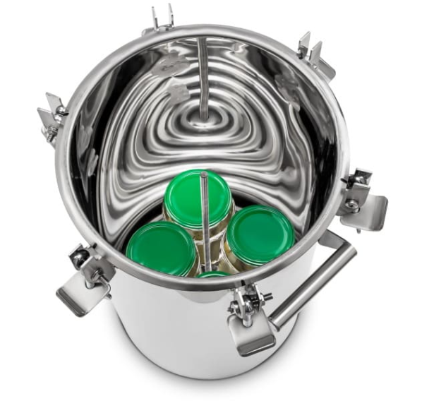 За герметичность автоклава отвечает крышка с силиконовым уплотнительным кольцом, которая надёжно крепится на баке с помощью винтовых зажимов. Для правильного использования в конструкцию встроен манометр для отслеживания давления, клапан сброса избыточного давления и ниппель для цифрового термометра. Кламповое соединение предназначено для установки дистиллятора и расширения возможностей Вашего автоклава.