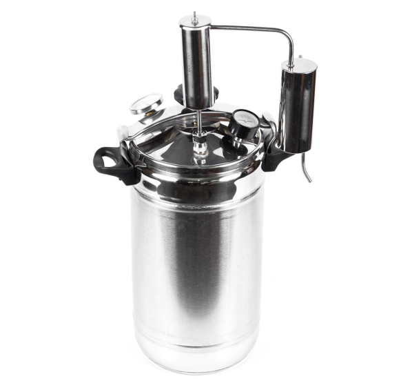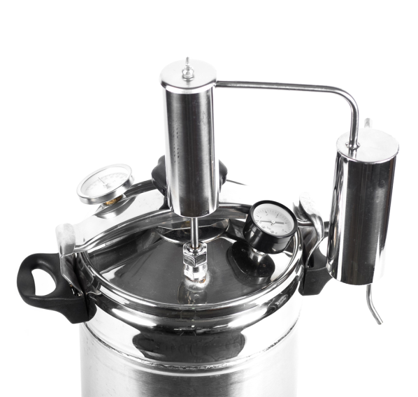 За герметичность автоклава отвечает крышка с силиконовым уплотнительным кольцом, которая надёжно крепится на баке с помощью специального зажима в центре крышки и ушек на корпусе автоклава для фиксации. Для правильного использования в конструкцию встроен манометр для отслеживания давления, клапан сброса избыточного давления и биметаллический термометр. Автоклав подходит для дистилляции — в комплекте имеется джин-корзина "Аромат" и сухопарник.