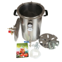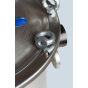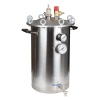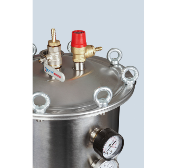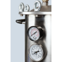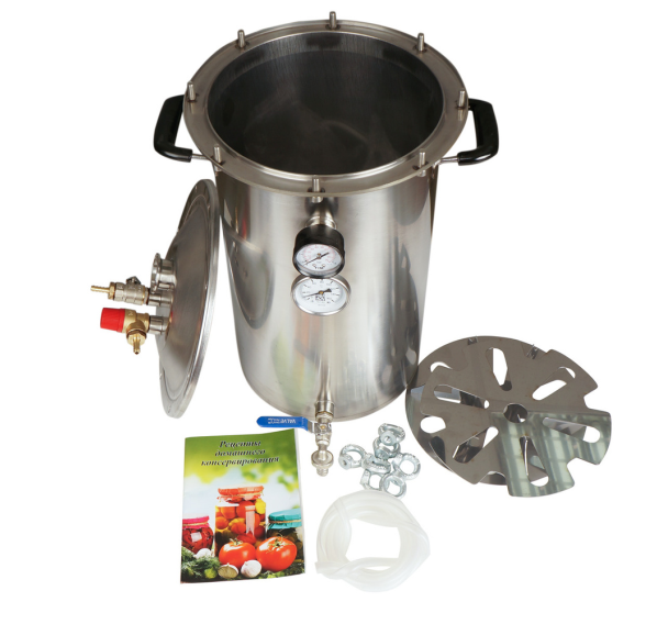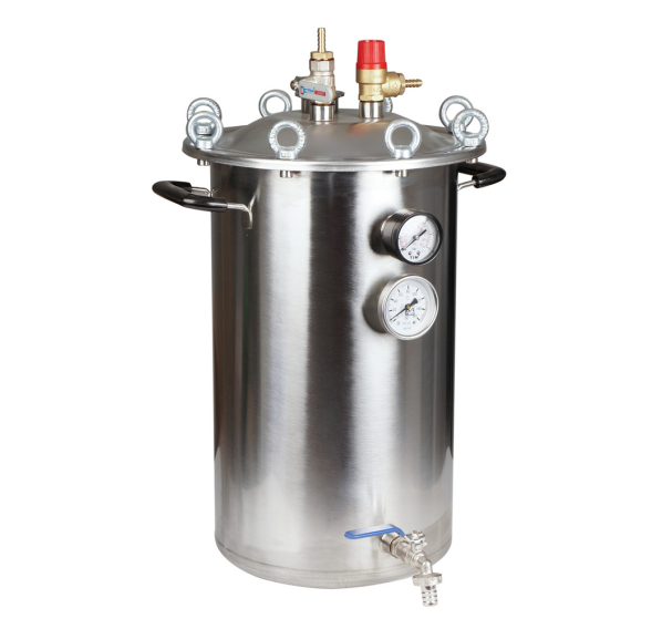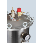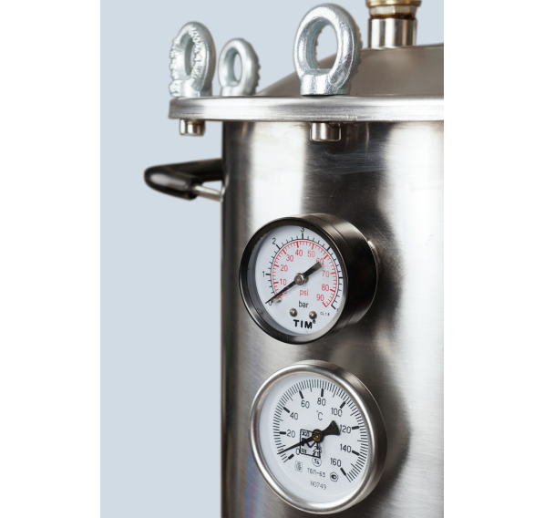 Силиконовое уплотнение прочно герметизирует крышку. Оно не имеет запаха, является химически нейтральным и выдерживает температуру до +200°С. Для правильного использования в конструкцию встроен манометр для отслеживания давления, клапан сброса избыточного давления и биметаллический термометр. Кламповое соединение предназначено для установки дистиллятора и расширения возможностей Вашего автоклава.