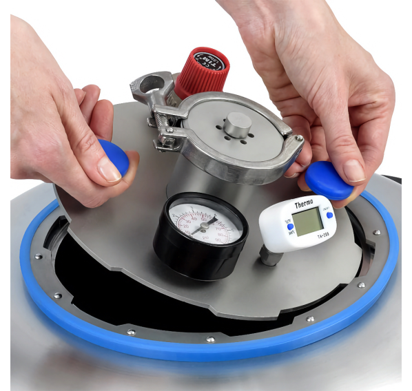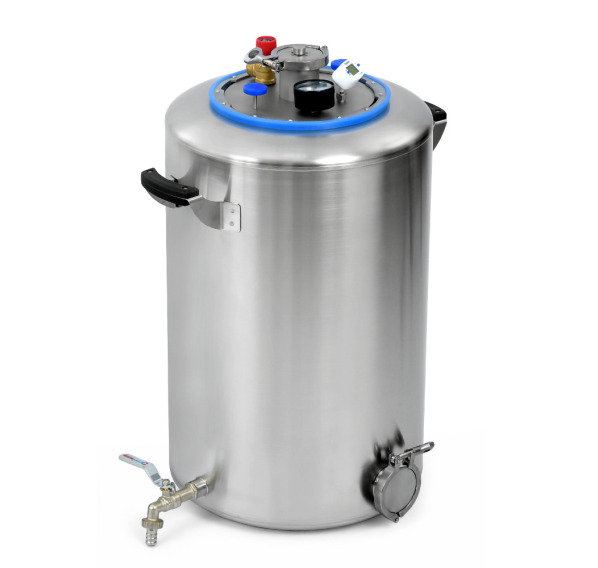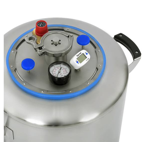 Крепкие ровные швы благодаря плазменной сварке не подвержены ржавлению. Крышка крепится намертво, риска стравливания нет. Толщина крышки — 3 мм. Она не выгнется даже при избыточном давлении. Края крышки фиксируются в пазах, где находится силиконовое уплотнение, что гарантирует абсолютную герметичность. Для правильного использования в конструкцию встроен манометр для отслеживания давления, клапан сброса избыточного давления и цифровой термометр. Кламповое соединение предназначено для установки дистиллятора и расширения возможностей Вашего автоклава.