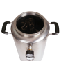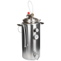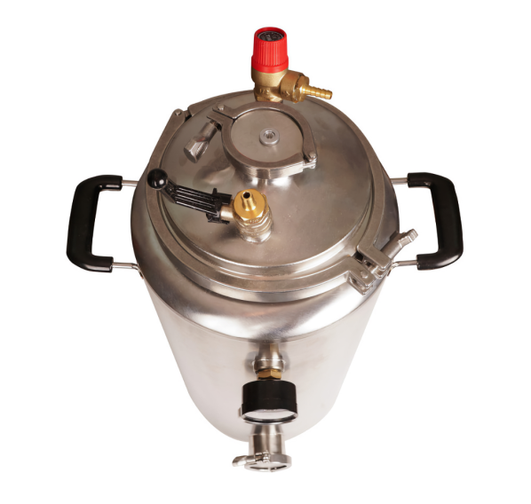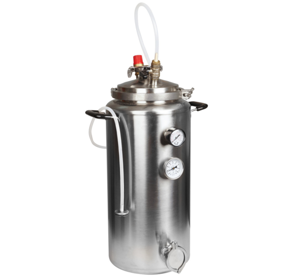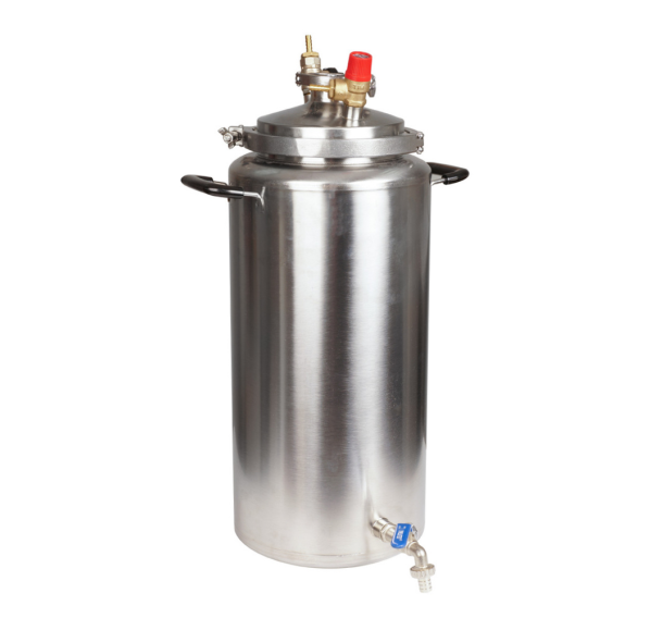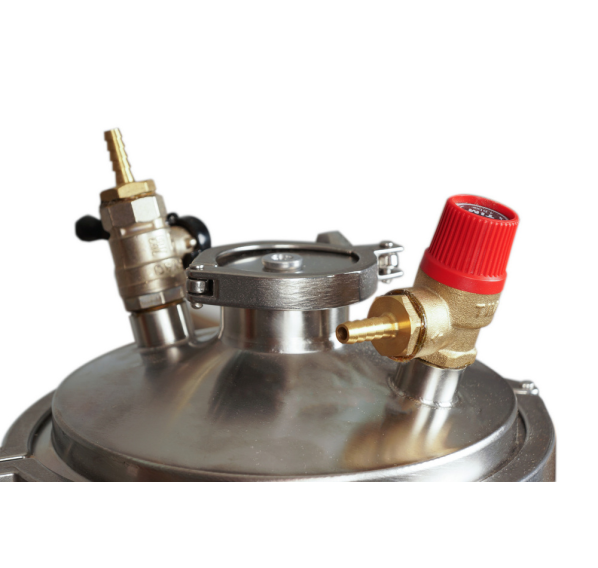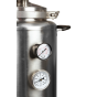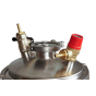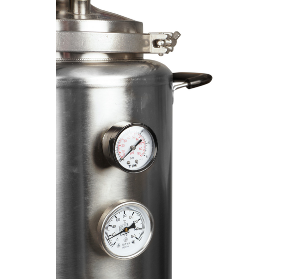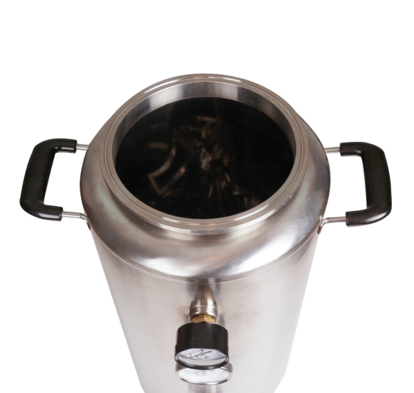 Силиконовое уплотнение прочно герметизирует крышку. Оно не имеет запаха, является химически нейтральным и выдерживает температуру до +200°С. Для правильного использования в конструкцию встроен манометр для отслеживания давления, клапан сброса избыточного давления и биметаллический термометр. Кламповое соединение предназначено для установки дистиллятора и расширения возможностей Вашего автоклава.