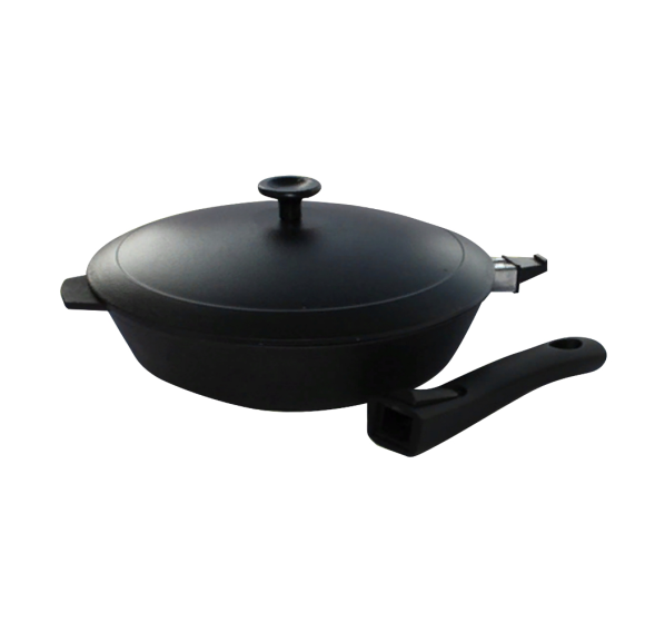 Чугунная сковорода изготовлена из литого чугуна, термообработанная. Такая сковорода со съёмной ручкой подходит к использованию как на плите, так и в духовом шкафу. Чугун по своей природе имеет антипригарные свойства, что не позволяет Вашей пище пригореть во время готовки.