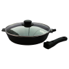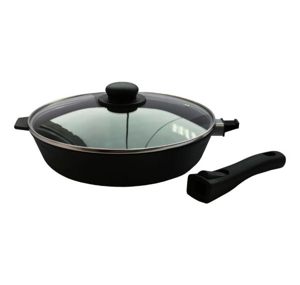 Чугунная сковорода изготовлена из литого чугуна, термообработанная. Такая сковорода со съёмной ручкой подходит к использованию как на плите, так и в духовом шкафу. Чугун по своей природе имеет антипригарные свойства, что не позволяет Вашей пище пригореть во время готовки.