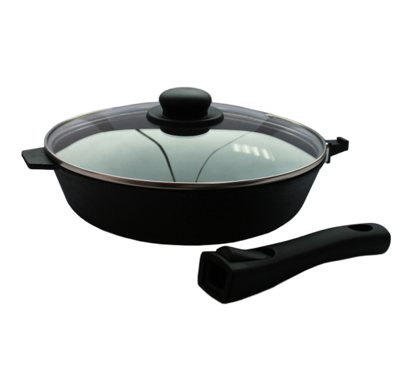Чугунная сковорода изготовлена из литого чугуна, термообработанная. Такая сковорода со съёмной ручкой подходит к использованию как на плите, так и в духовом шкафу. Чугун по своей природе имеет антипригарные свойства, что не позволяет Вашей пище пригореть во время готовки.