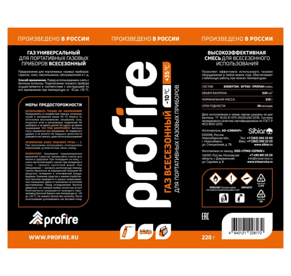 Цанговый газовый баллон Profire предназначен для присоединения к портативному оборудованию: лампам, плитам, горелкам, обогревателям и т.п. Подходит для использования при температурах внешней среды от +35°С до -10°С.