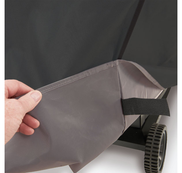 Чехол изготовлен из водонепроницаемого PEVA материала с подкладкой из полиэстера. Чехол имеет текстильные застёжки для ещё более точного соответствия формы Вашего гриля. Благодаря рукоятке, чехол легко снимается с гриля.