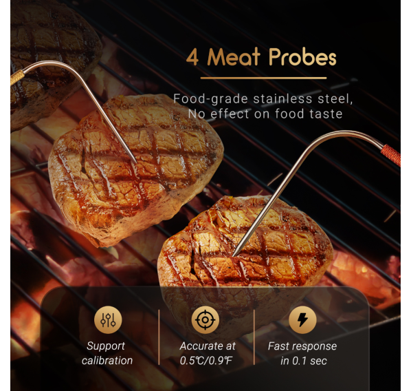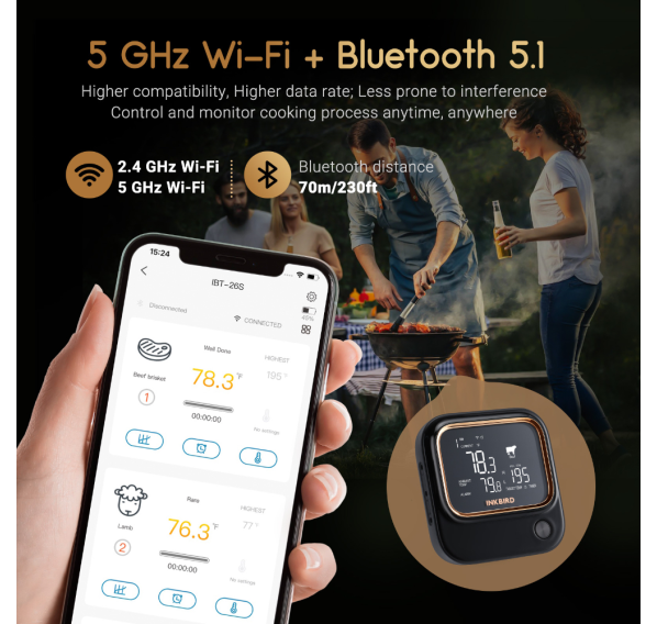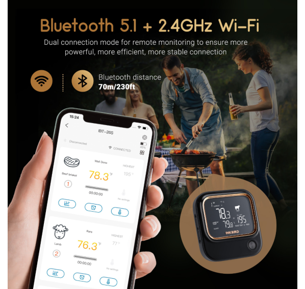 Inkbird IBT-26S – Wi-Fi и Bluetooth-термометр с 4 щупами в комплекте. Основное отличие от большинства термометров – это возможность связи с Вашим смартфоном как через Bluetooth, так и через Wi-Fi, который также работает через облако. Большим плюсом является возможность подключения 6 щупов одновременно!
