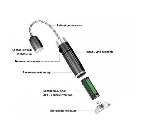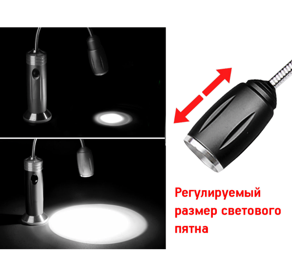 Благодаря гибкой ножке Вы сможете регулировать уровень освещённости, направляя свет на нужную часть рабочей поверхности. В основании лампы имеются мощные магниты, с помощью которых осветительный прибор можно установить на верхнюю часть крышки гриля или по бокам.