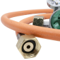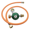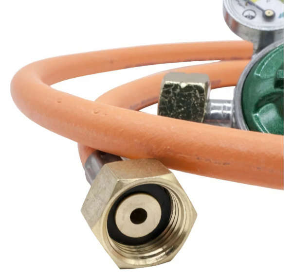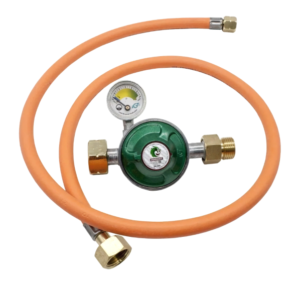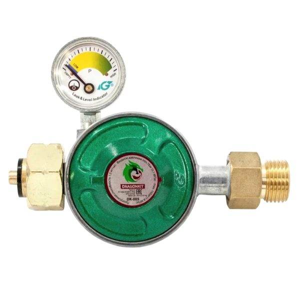 В комплекте идёт шланг 1,1 м и регулятор давления газа DK-005 с манометром, кнопкой и предохранительным клапаном.