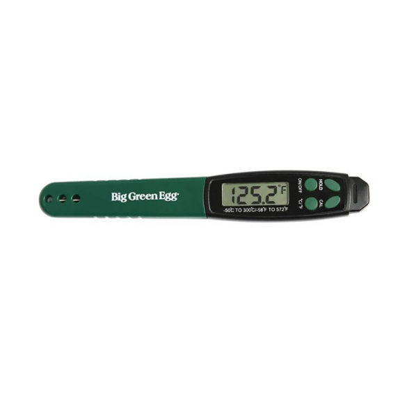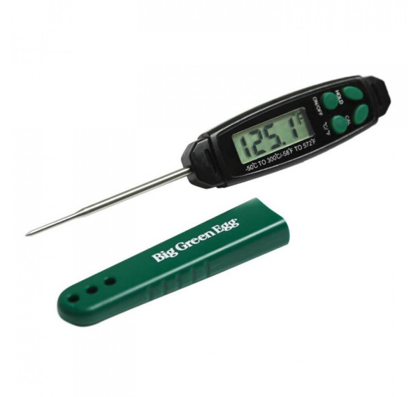 Официально он называется «Электронный кулинарный экспресс-термометр Big Green Egg (Big Green Egg Quick-Read Digital Food Thermometer)». Ни одно из этих слов не лишнее. За несколько секунд он показывает температуру запекаемой Вами ноги ягнёнка или фаршированного цыплёнка. С точностью до одного градуса (до 300°C). Термометр легко помещается в карман, а его ручка одновременно служит футляром для хранения.