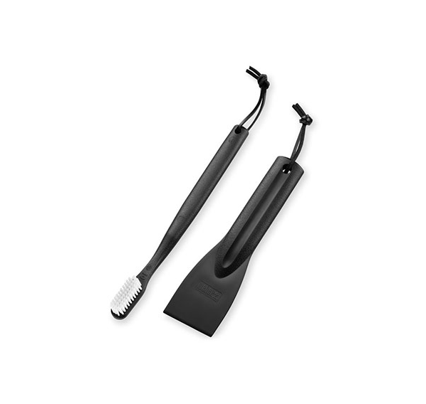 Набор для чистки газовых грилей включает два инструмента — лопатку для очистки от крупных загрязнений и пластиковую щетку для очистки горелки.