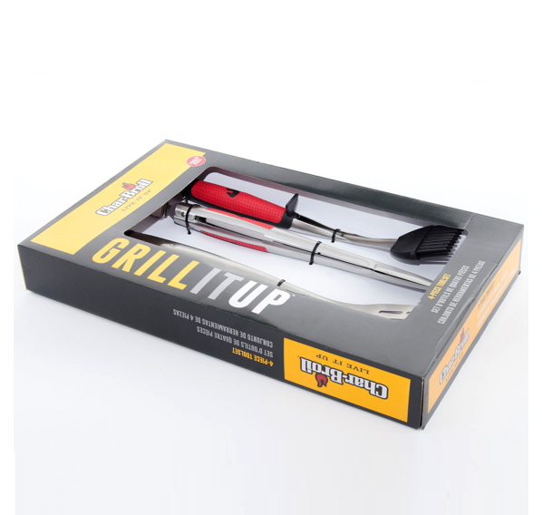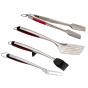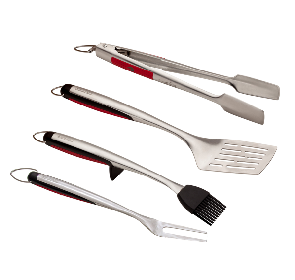 Стальная лопатка стандартной ширины, классические щипцы, вилка и силиконовая кисть с удобной подставкой. Все инструменты снабжены противоскользящими ручками. Полный набор на все случаи жизни.