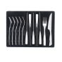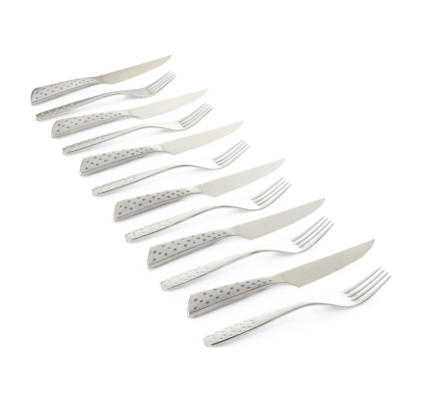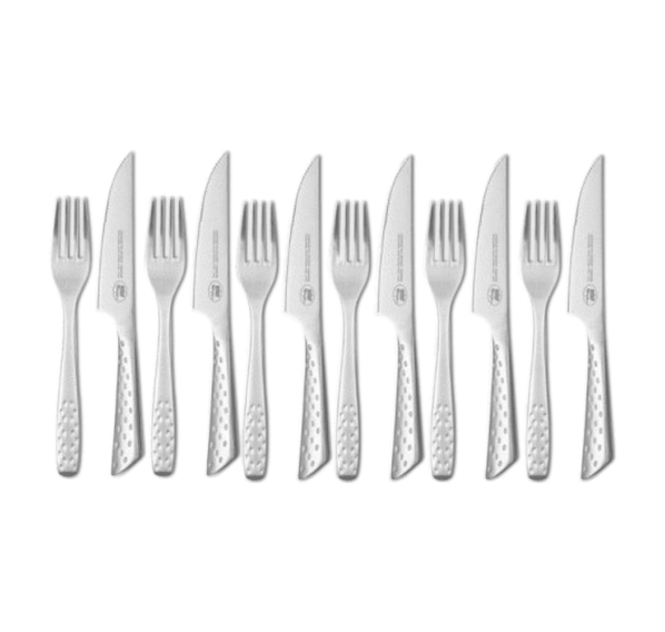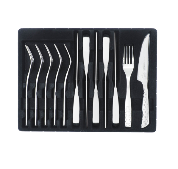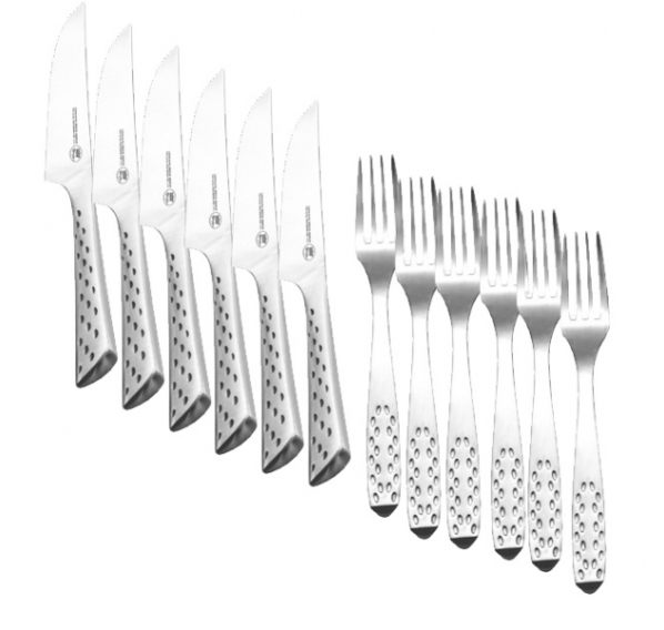 Особенно вкусное мясо, приготовленное на гриле до золотистой корочки снаружи и при этом сочное внутри. Нож для стейка имеет очень острое лезвие, изготовленное из специальной стали. Его ручка удобно помещается в руке. Вилка для стейка имеет удлиненные и заостренные зубья. Она также может использоваться для печеного картофеля, овощей или салата.