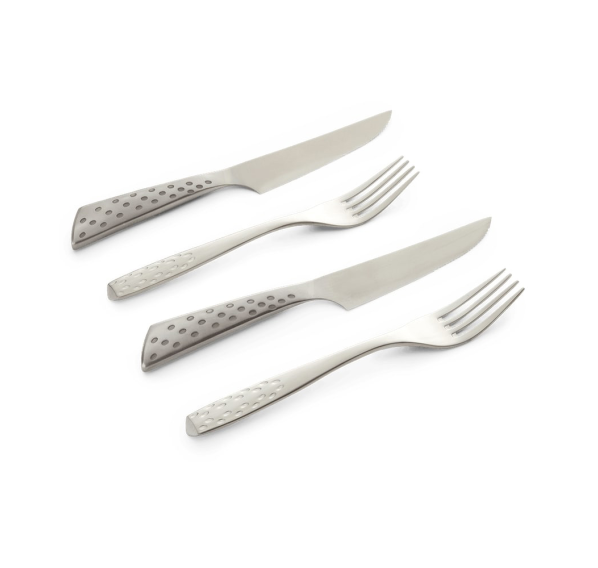 Особенно вкусное мясо, приготовленное на гриле до золотистой корочки снаружи и при этом сочное внутри. Нож для стейка имеет очень острое лезвие, изготовленное из специальной стали. Его ручка удобно помещается в руке. Вилка для стейка имеет удлиненные и заостренные зубья. Она также может использоваться для печеного картофеля, овощей или салата.