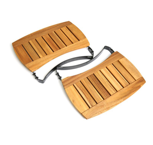Навесные боковые столики для ингредиентов и кухонных принадлежностей из акации, выращенной экоустойчивыми методами. Эта древесина твердой породы с характерной фактурой часто используется для изготовления дорогой мебели. Складные, простые в установке и жаростойкие.