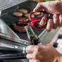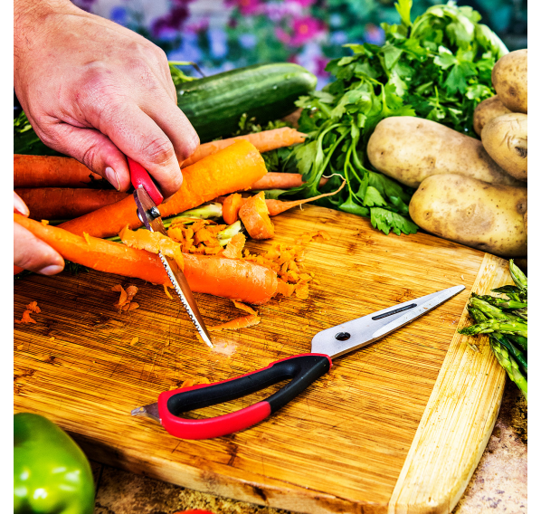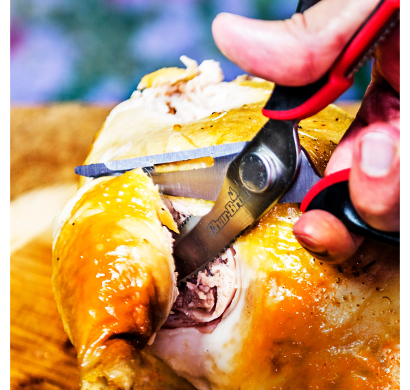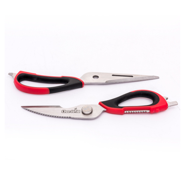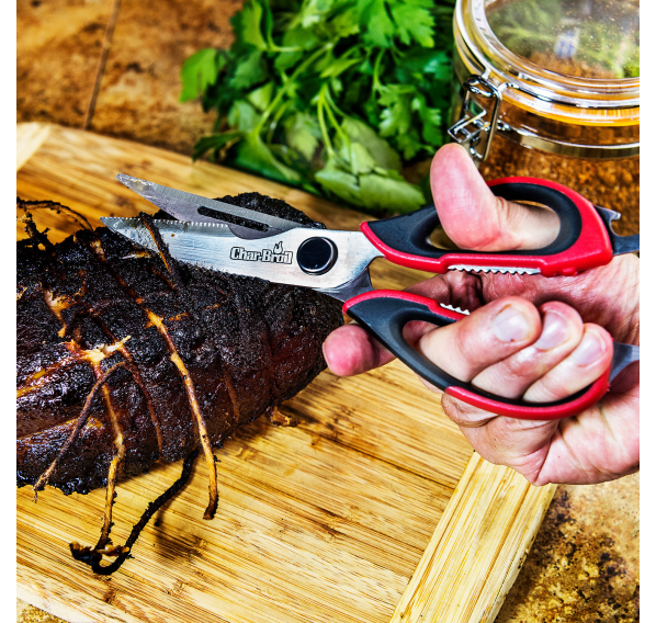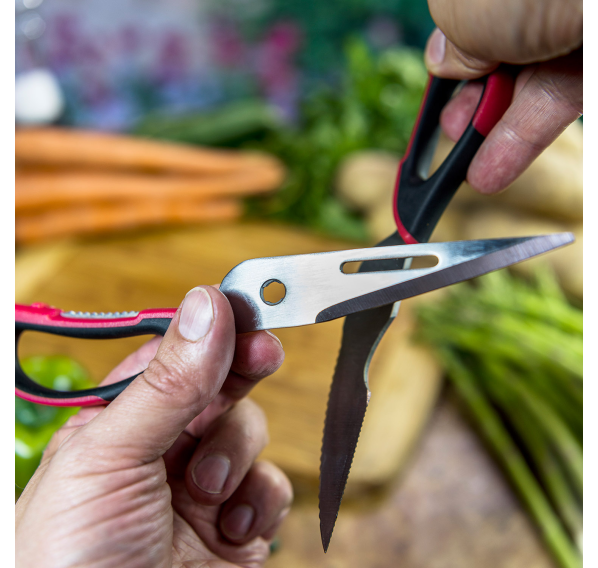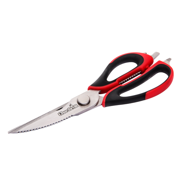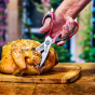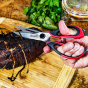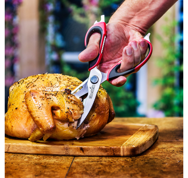 Ножницы для мяса с комфортным захватом — это универсальный инструмент, который идеально подходит для готовки мяса, разрезания костей или вскрытия скорлупы. Эти ножницы для мяса с лезвиями из нержавеющей стали и удобной ручкой для захвата имеют встроенный открыватель для бутылок, щелкунчик для орехов, захват и отвертку с плоской головкой для множества применений. Ножницы подходят для мытья в посудомоечной машине.