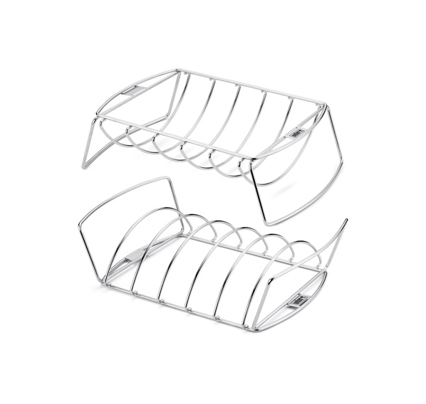 Подставка позволяет эффективно использовать место на решётке гриля. Повернутая одной стороной она вмещает внушительный кусок говядины или свинины, а если ее перевернуть, то в вашем распоряжении будет емкий держатель для рёбрышек. Такая конструкция 2-в-1 позволяет существенно расширить возможности приготовления, и одновременно минимизировать используемое пространство.