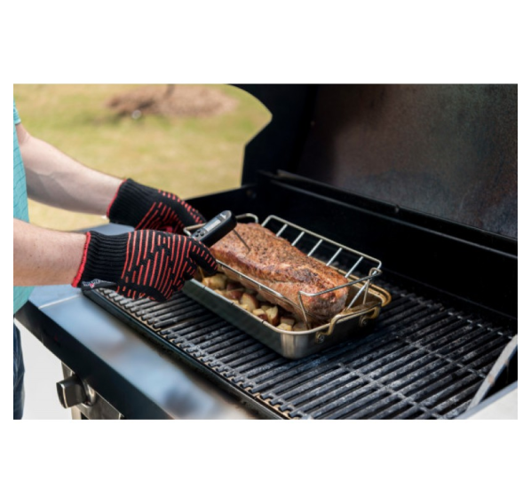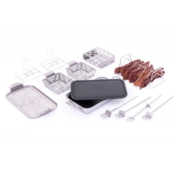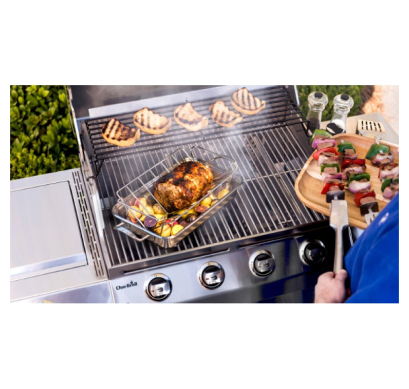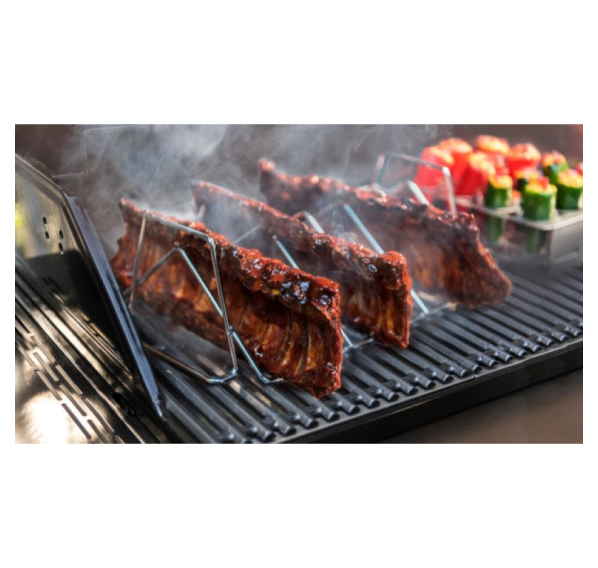 Двусторонняя подставка из нержавеющей стали Char-Broil Grill+ разработана как для использования с глубоким блюдом-основой Grill+, так и в качество отдельного аксессуара. С одной стороны подставка вмещает внушительный кусок мяса, а с другой позволяет запекать рёбрышки.