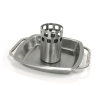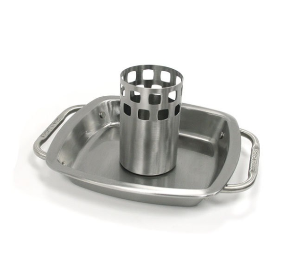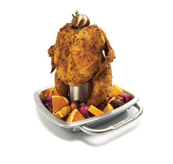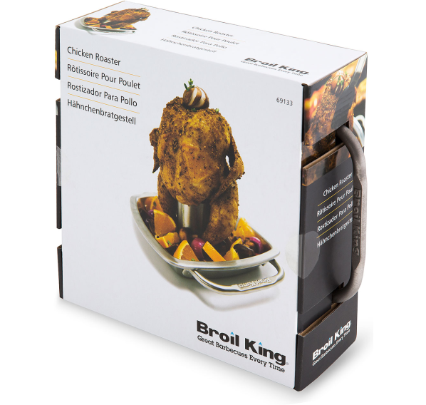 Жаровня для курицы Broil King из нержавеющей стали. Жаровня имеет большие рукоятки. Держатель для пивной банки вполне способен заменить саму пивную банку и сверху имеет отверстие, способствующее более эффективному пропариванию курицы. Так курица готовится в вертикальном положении, сохраняя все соки.