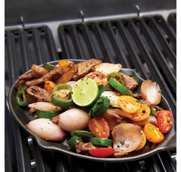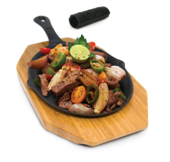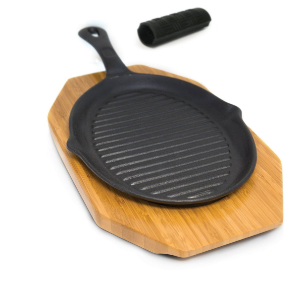 Прочная чугунная сковорода для приготовления фахита и других жареных блюд на гриле. Набор включает в себя бамбуковое основание и силиконовый чехол на ручку для удобного и безопасного переноса сковороды.
