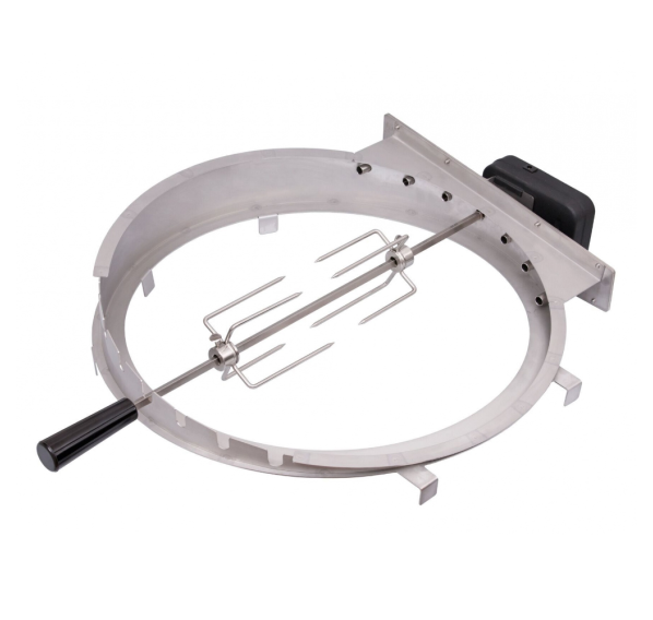 Прочный вращающийся вертел из нержавеющей стали включает две вилки для мяса с длинными зубцами для надёжной фиксации мяса. Двигатель с батарейным питанием внутри металлического корпуса прочен и надёжен.