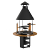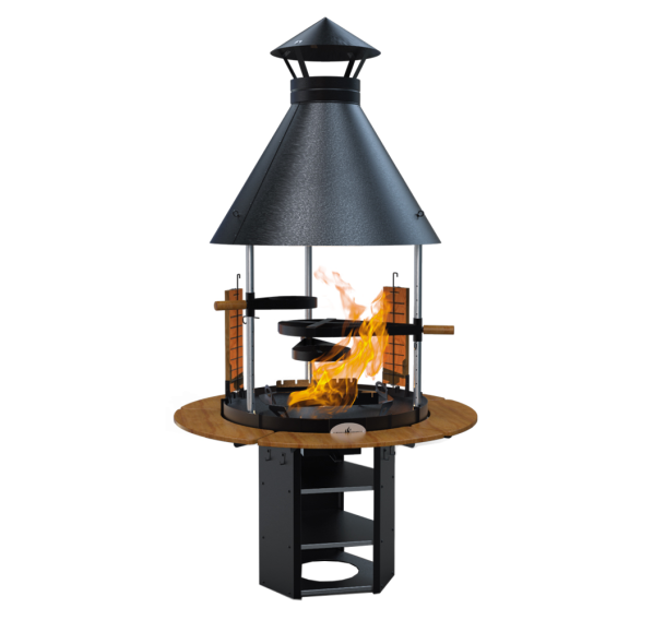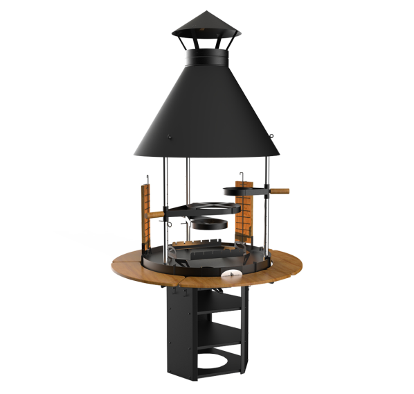 Стальная конструкция покрыта защитным слоем огнеупорной краски. Круглый очаг закрыт от непогоды цилиндрическим куполом с дымоходом. На стойках из нержавеющей стали закреплены регулируемые подставки, положение которых можно менять в процессе готовки. Шашлычный модуль легко устанавливать и снимать. В комплекте предусмотрена ольховая доска для копчения. На нижних полках размещают дрова или мешки с углем. Инструменты, закуски и бокалы можно расположить на подвесных столиках, создающих единую столешницу вокруг очага. Для чистки очага предусмотрен выдвижной зольник.