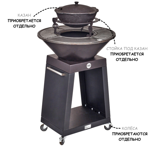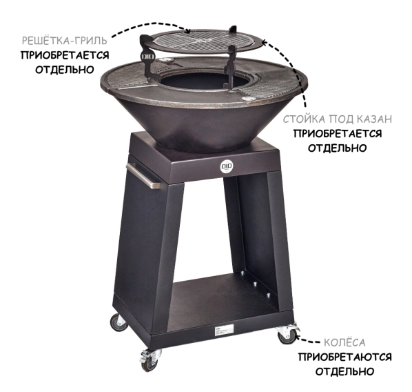 Обратите внимание на то, что решётка-гриль, стойка под казан, подставка под шампуры, шампуры, казан, чехол, колёса, набор инструментов и крючки-держатели для данного гриля-очага приобретаются отдельно!