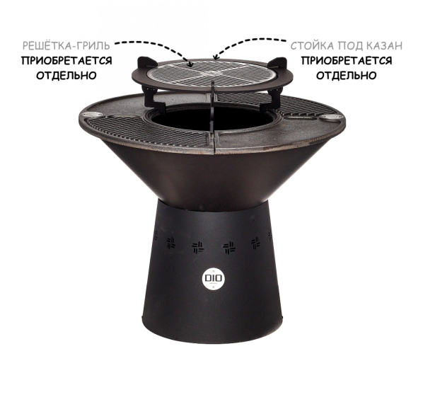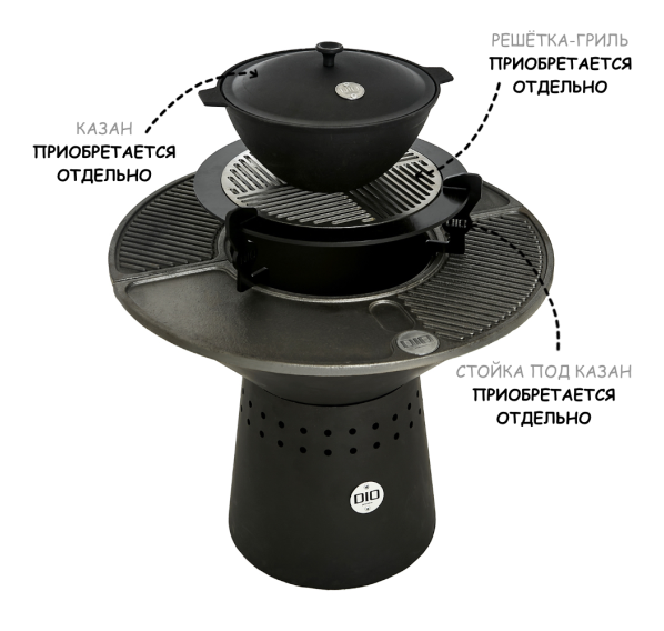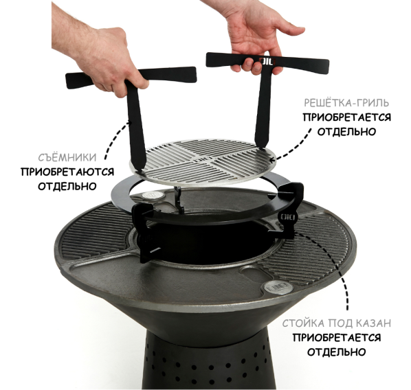 Обратите внимание на то, что решётка-гриль, cъёмник для решётки-гриль, стойка под казан, подставка под шампуры, шампуры, казан и чехол для данного гриля-очага приобретаются отдельно!
