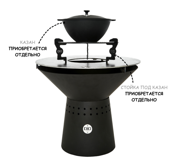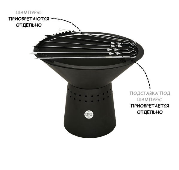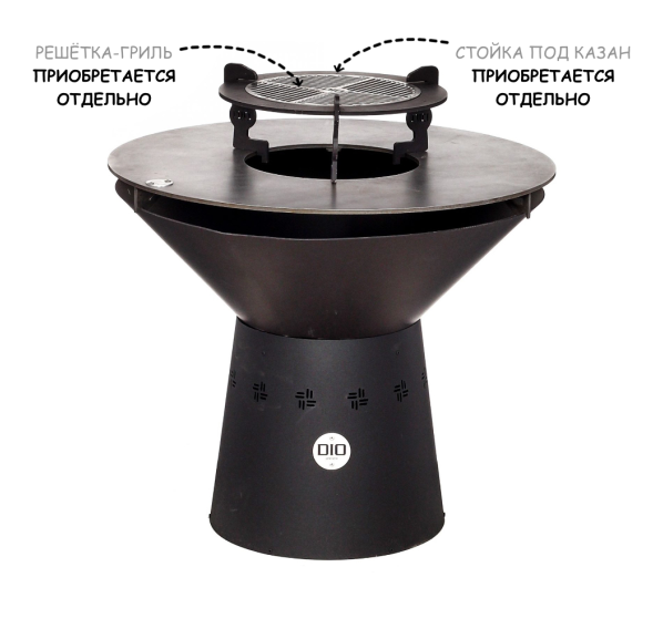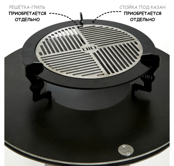 Обратите внимание на то, что решётка-гриль, стойка под казан, подставка под шампуры, шампуры, казан и чехол для данного гриля-очага приобретаются отдельно!