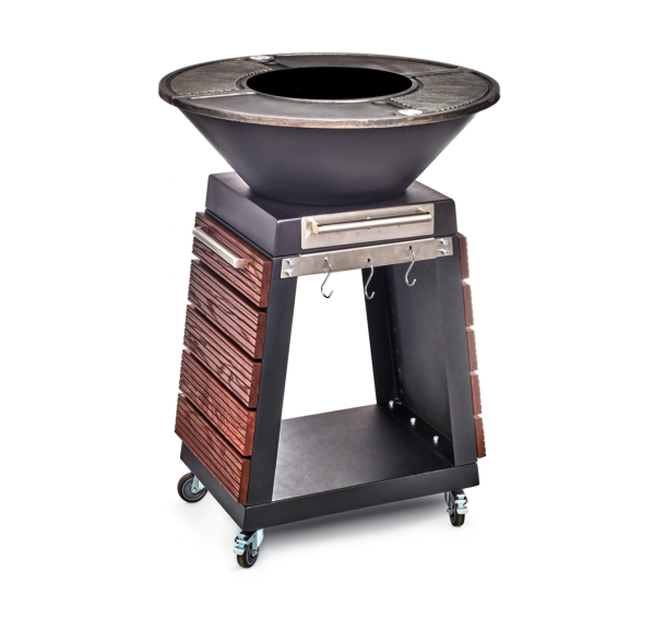 Прямые линии, большая подставка с объёмным дровником и сборная жарочная поверхность со встроенным жиросборником: Dio Premium Exact 750 прекрасно впишется на летнюю кухню базы отдыха, террасу ресторана или в релакс-зону банного комплекса. При этом, благодаря полой эргономичной подставке, гриль не выглядит громоздким — и им очень удобно пользоваться! Мягкое тепло дерева выгодно оттеняется строгим блеском металла, подчёркивая безупречную эстетику модели.