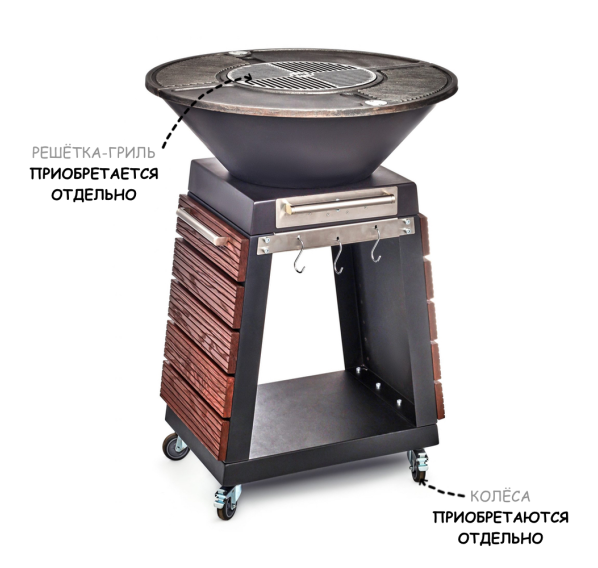 Обратите внимание на то, что решётка-гриль, стойка под казан, подставка под шампуры, шампуры, казан, чехол, колёса и крючки-держатели для данного гриля-очага приобретаются отдельно!