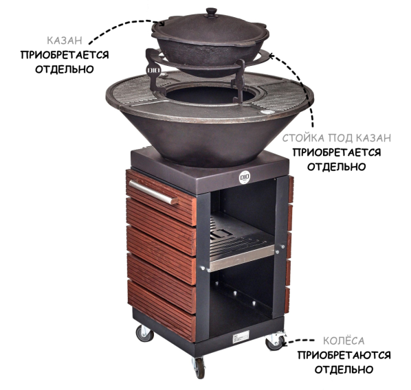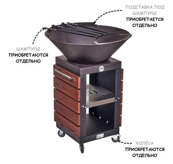 Обратите внимание на то, что решётка-гриль, стойка под казан, подставка под шампуры, шампуры, казан, чехол и колёса для данного гриля-очага приобретаются отдельно!