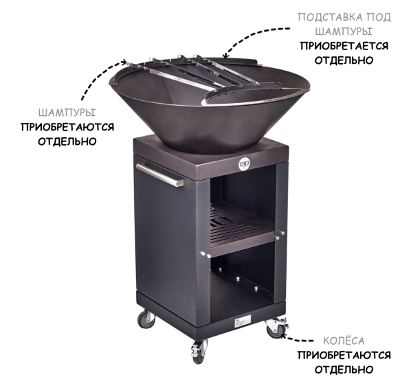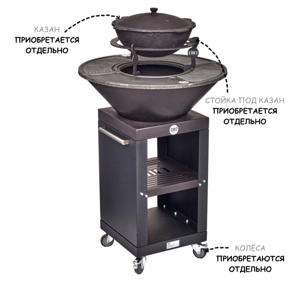 Обратите внимание на то, что решётка-гриль, стойка под казан, подставка под шампуры, шампуры, казан, чехол и колёса для данного гриля-очага приобретаются отдельно!