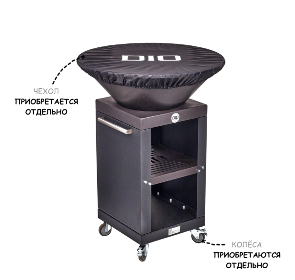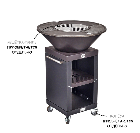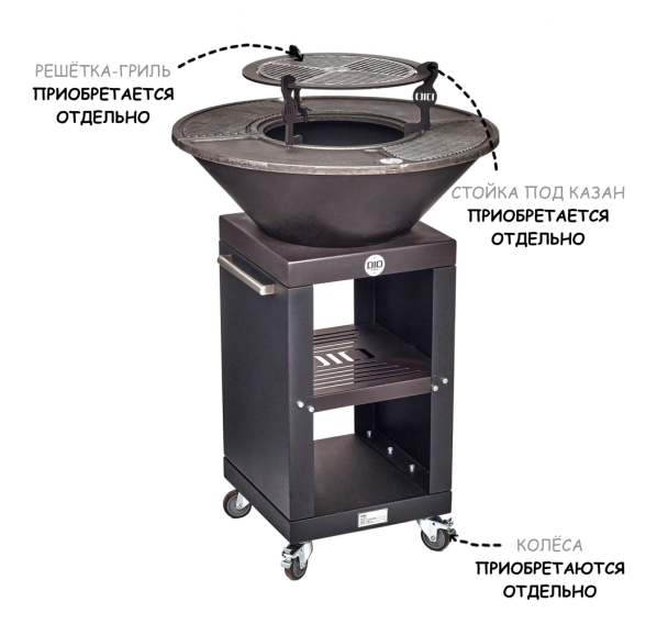 Обратите внимание на то, что решётка-гриль, стойка под казан, подставка под шампуры, шампуры, казан, чехол и колёса для данного гриля-очага приобретаются отдельно!