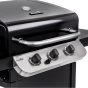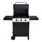 Три основные горелки из нержавеющей стали защищены отсекателями. Встроенный в крышку термометр позволяет легко контролировать температуру. Стальной корпус, покрытый черной эмалью, имеет просторную нижнюю полку для хранения газового баллона. Крупные колеса позволяют легко перемещать гриль по участку. Гриль запускается нажатием одной кнопки пьезоэлектрического поджига и уже через несколько минут готов к работе. Дополнительная решетка для разогрева продуктов из нержавеющей стали. Широкие боковые пристолья дают достаточно места для комфортной работы. Очень удобный выдвигающийся лоток жиросборника, который легко чистить.