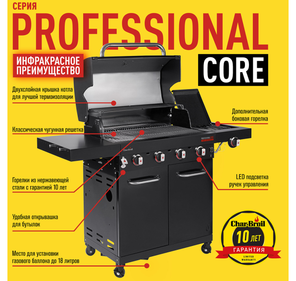 Новейшие газовые грили Char-Broil серии Professional третьего поколения, являются самыми популярными моделями в США, Европе и по всему миру. Газовые грили Professional оснащаются запатентованной инфракрасной пластиной TRU Infrared, которая обеспечивает равномерный жар по всей решётке и предохраняет от вспышек капающего жира в котле. Эта просторная модель с четырьмя основными и дополнительной боковой горелками прекрасно подойдёт даже для самой большой компании.