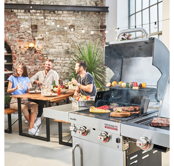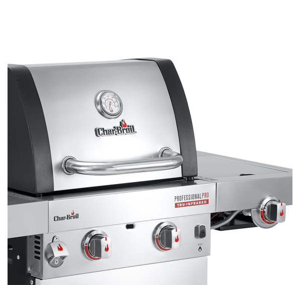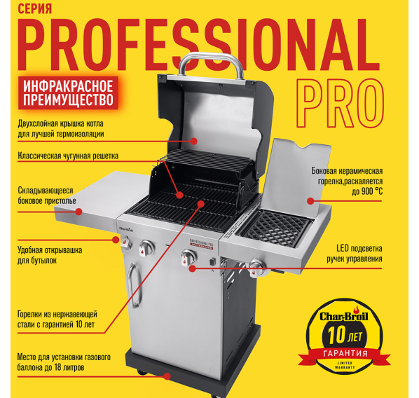 Новейшие газовые грили Char-Broil серии Professional третьего поколения, являются самыми популярными моделями в США, Европе и по всему миру. Газовые грили Professional оснащаются запатентованной инфракрасной пластиной TRU Infrared, которая обеспечивает равномерный жар по всей решётке и предохраняет от вспышек капающего жира в котле. Эта компактная модель с двумя основными и дополнительной боковой горелками прекрасно подойдет для небольшой семьи.