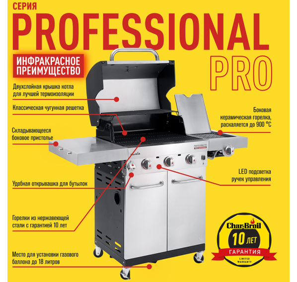 Новейшие газовые грили Char-Broil серии Professional третьего поколения, являются самыми популярными моделями в США, Европе и по всему миру. Газовые грили Professional оснащаются запатентованной инфракрасной пластиной TRU Infrared, которая обеспечивает равномерный жар по всей решётке и предохраняет от вспышек капающего жира в котле. Эта сбалансированная модель среднего размера с тремя основными и дополнительной боковой горелками прекрасно подойдёт для любой компании.