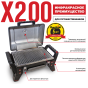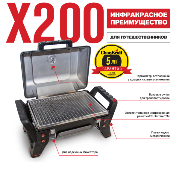 Гриль Char-Broil X200 комплектуется запатентованной инфракрасной решёткой TRU Infrared, которая предотвращает вспышки от капающего жира и не пересушивает мясо. Гриль запускается простым нажатием кнопки пьезоэлектрического поджига. В верхнюю крышку из литого алюминия встроен термометр. Съёмный жиросборник снизу предельно упрощает процедуру очистки.