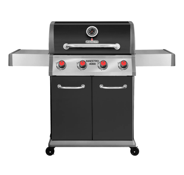 В Koch Maestro 4000 предусмотрены боковые столики на которые можно поставить тарелку для стейков или специи. Всепогодные колёса облегчают транспортировку гриля по зоне барбекю. Крючки для аксессуаров дают возможность хранить всё необходимое под рукой. Дверцы шкафа выполняют декоративную функцию, а также защищают детей и домашних животных от ожогов. Углубления на чугунной решётке, позволяющие безопасно снимать её даже в перчатках.