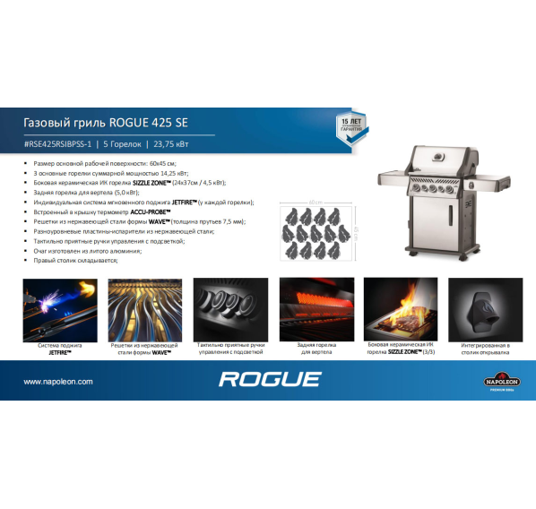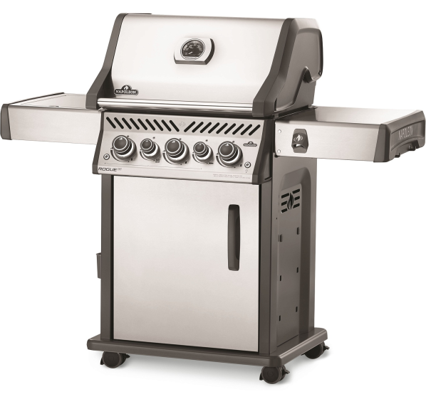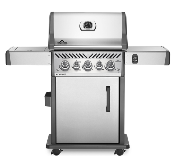 Этот гриль с тремя основными горелками, задней для вертела, боковой инфракрасной горелкой для обжаривания стейков и высокой крышкой имеет всё необходимое для приготовления изысканных блюд. Для дополнительного удобства гриль Napoleon Rogue 425 SE оснащён подсветкой ручек управления, колёсами для комфортного перемещения и открывалкой для напитков.