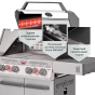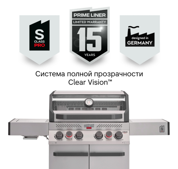 Главной особенностью модели является инновационное решение — большое панорамное стекло Clear Vision, выполненное из специального сверхпрочного закалённого материала. Благодаря этому окну владелец имеет возможность визуально контролировать процесс приготовления блюд прямо изнутри гриля, создавая незабываемые впечатления от процесса готовки. Primeliner S Class Pro 4B изготовлен исключительно из высококачественных материалов: корпус выполнен из прочной нержавеющей стали, отдельные элементы выполнены из литого алюминия, обеспечивая долговечность и устойчивость конструкции даже при интенсивном использовании. Гриль оснащён четырьмя мощными газовыми турбогорелками Blade, обеспечивающими равномерное распределение тепла и быстрый нагрев рабочей поверхности. Дополнительные опции включают увеличенную боковую инфракрасную горелку Broil Zone+, предназначенную для быстрой обжарки мяса и овощей, а также заднюю инфракрасную горелку, создающую идеальные условия для приготовления различных блюд. Особое внимание уделено комфорту пользователей: устройство оснащено встроенным модулем копчения Prime Smoker, позволяющим экспериментировать с ароматическими дымами, придавая блюдам особый вкус и аромат. Для удобства эксплуатации предусмотрен термостойкий защитный коврик на пристолье, предотвращающий повреждения.
