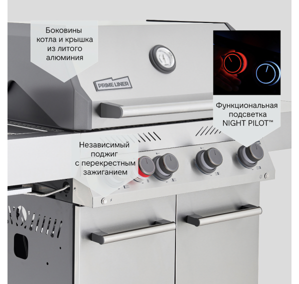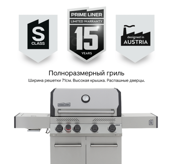 Совместная разработка австрийских инженеров из бюро Primeliner и скандинавского дизайнера Кааре Магнуса. Модель 2025 года. Газовый гриль Primeliner S Class 4B — это продвинутый полноразмерный гриль для большой компании в корпусе из нержавеющей стали и с четырьмя основными горелками. Современный дизайн, максимальная техническая оснащённость и качество говорят сами за себя. Производитель даёт 15-ти летнюю гарантию на все основные компоненты.