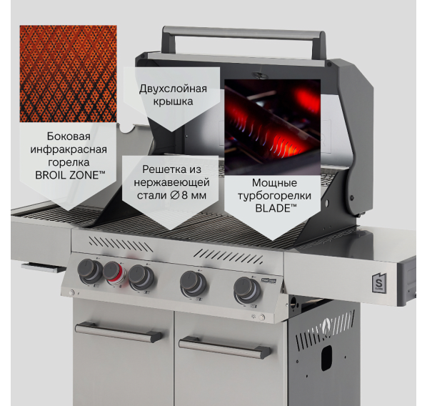 Мощные запатентованные турбогорелки Blade разгоняют гриль до +300°С за 10 минут. В левом пристолье установлена боковая инфракрасная горелка Broil Zone. Как и у всех топовых грилей, основная решётка выполнена из нержавеющей стали толщиной 8 мм. Новейшая система независимого пьезоподжига Prime Fire с перекрёстным зажиганием горелок и ручки с функциональной "ночной" подсветкой Night Pilot. Плюс все классические фишки продвинутого гриля — двойная крышка котла с боковинами из литого алюминия, поддон жиросборника из нержавеющей стали, встроенные крючки для инструментов и усиленные прорезиненные колёса с фиксаторами. Вставки лотка-жиросборника уже в базовой комплектации. При необходимости, Вы всегда сможете "прокачать" Вашего любимца. Разработанные специально для модели S Class чёрный электрический вертел и двухсторонняя чугунная планча продвинут Ваши кулинарные возможности на профессиональный уровень (приобретаются отдельно).