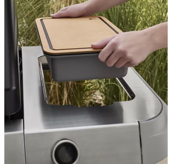 Выдающимся новшеством газового гриля Weber Genesis E-425W является встроенная система Weber Works, расположенная на правом боковом столе. Эта функциональная система включает в себя съёмную крышку, направляющие и крючки, предназначенные для того, чтобы Ваши инструменты и принадлежности всегда были организованы и находились в пределах досягаемости.