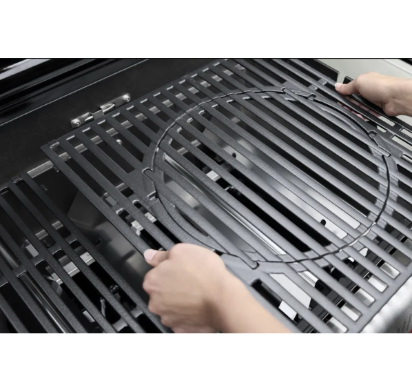 Выдающимся новшеством газового гриля Weber Genesis E-435W является встроенная система Weber Works, расположенная на правом боковом столе. Эта функциональная система включает в себя съёмную крышку, направляющие и крючки, предназначенные для того, чтобы Ваши инструменты и принадлежности всегда были организованы и находились в пределах досягаемости. В левом боковом столе расположена конфорка для приготовления фирменного соуса или гарнира, пока основное блюдо готовится под крышкой гриля.