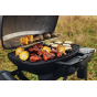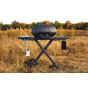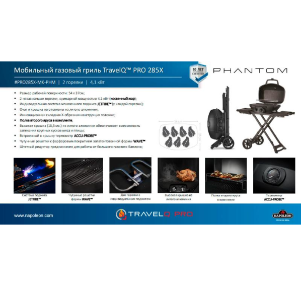 Подставка обеспечивает комфортную высоту для работы на гриле. Оснащена столиками с крючками для инструментов и колёсами для удобного перемещения. Тележка легко складывается простым движением. Отличительные особенности гриля Napoleon TravelQ PRO 285X Phantom: наличие в комплекте решётки для подогрева (второй уровень) и роскошный чёрный матовый цвет от верхней части крышки до тележки. В комплекте шланг и редуктор для подключения к стандартному газовому баллону.
