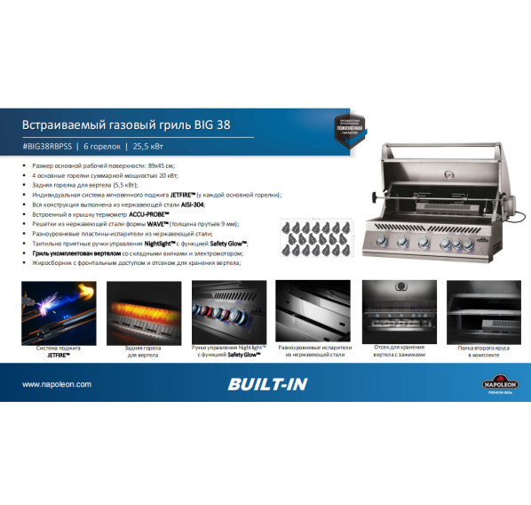 Встраиваемый газовый гриль Napoleon BIG-38 — обновлённая модель 2024 года. Ручки управления Nightlight позволят включать гриль одним движением и изменят свет с синего на красный для обозначения работающей горелки. Диапазон рабочих температур создаст оптимальные условия для томления, запекания и прямого грилинга под чётким контролем датчика температуры Accu-Probe. Оснащается внутренней подсветкой рабочей зоны. Приятно удивит минимальный уход за решёткой толщиной 9,5 мм из нержавеющей стали в виде фирменной волны Wave, а её универсальность и красивый узор на продукте подчеркнёт уникальный стиль блюд. Гриль изготовлен из высококачественной нержавеющей стали, что гарантирует долгий срок службы.