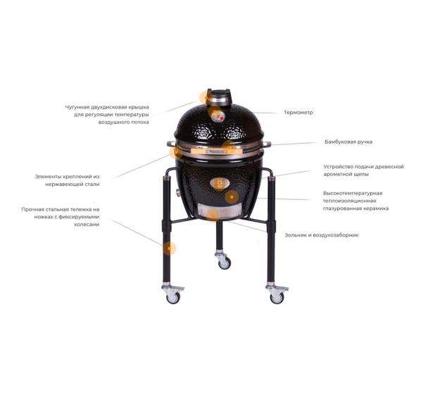 Базовая комплектация позволит Вам извлечь максимум пользы и полноценно использовать гриль Monolith Junior Pro 2.0 уже в первые дни без дополнительных затрат. Благодаря эксклюзивной системе подачи ароматной щепы для копчения, Вы сможете безопасно досыпать её в гриль прямо на угли, не открывая крышку гриля и не сбрасывая температуру во время готовки.