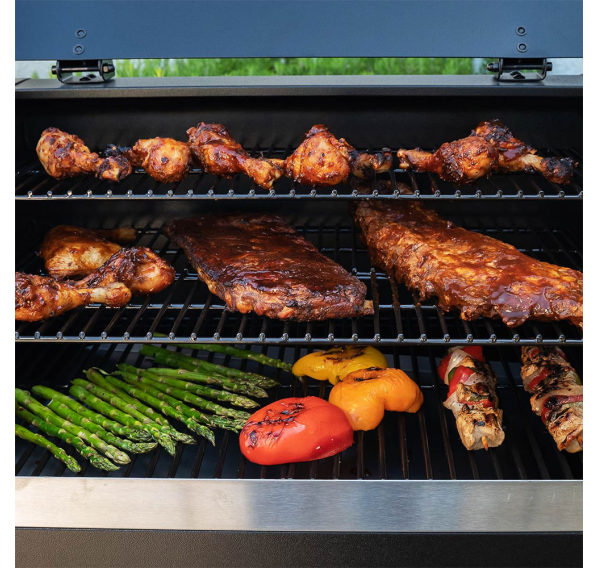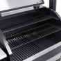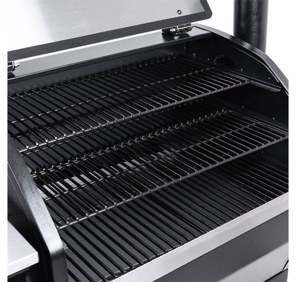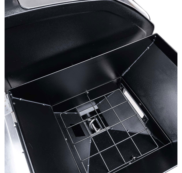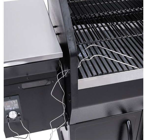 Гриль создан для комфорта и впечатляющих результатов. Огромная площадь приготовления — 6812,9 см² решёток и две дополнительные полки — позволяет с лёгкостью накормить большую компанию. Вы получаете полный контроль над процессом благодаря приложению для смартфона (Wi-Fi/Bluetooth) и четырём разъёмам для щупов, которые позволяют контролировать готовку, не поднимая крышку. Продуманность в деталях обеспечивает максимальное удобство: вместительный бункер на 12,5 кг с окошком и дверцей для сброса пеллет, специальная полка для золы и эффективная система отвода жира делают обслуживание простым и быстрым. Всё это заключено в надёжный корпус из нержавеющей стали с отличной термоизоляцией, а для удобства перемещения предусмотрены колёса с фиксаторами и вместительный шкаф с крючками для инструментов.